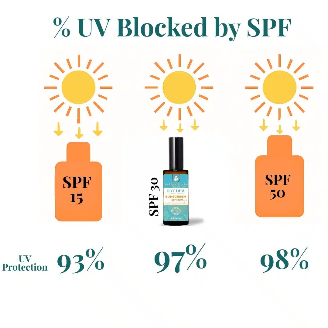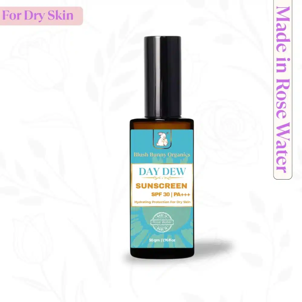 Day Dew Sunscreen SPF 30 PA+++ is a non-toxic, rose water-based formula specially crafted for dry, sensitive skin. Powered by Yashad Bhasma, Hyaluronic Acid, and plant-based oils like Raspberry and Macadamia, it hydrates deeply while shielding your skin from 97% of harmful UVB rays—without leaving a white cast or clogging pores. Just clean, breathable sun protection that feels like skincare.