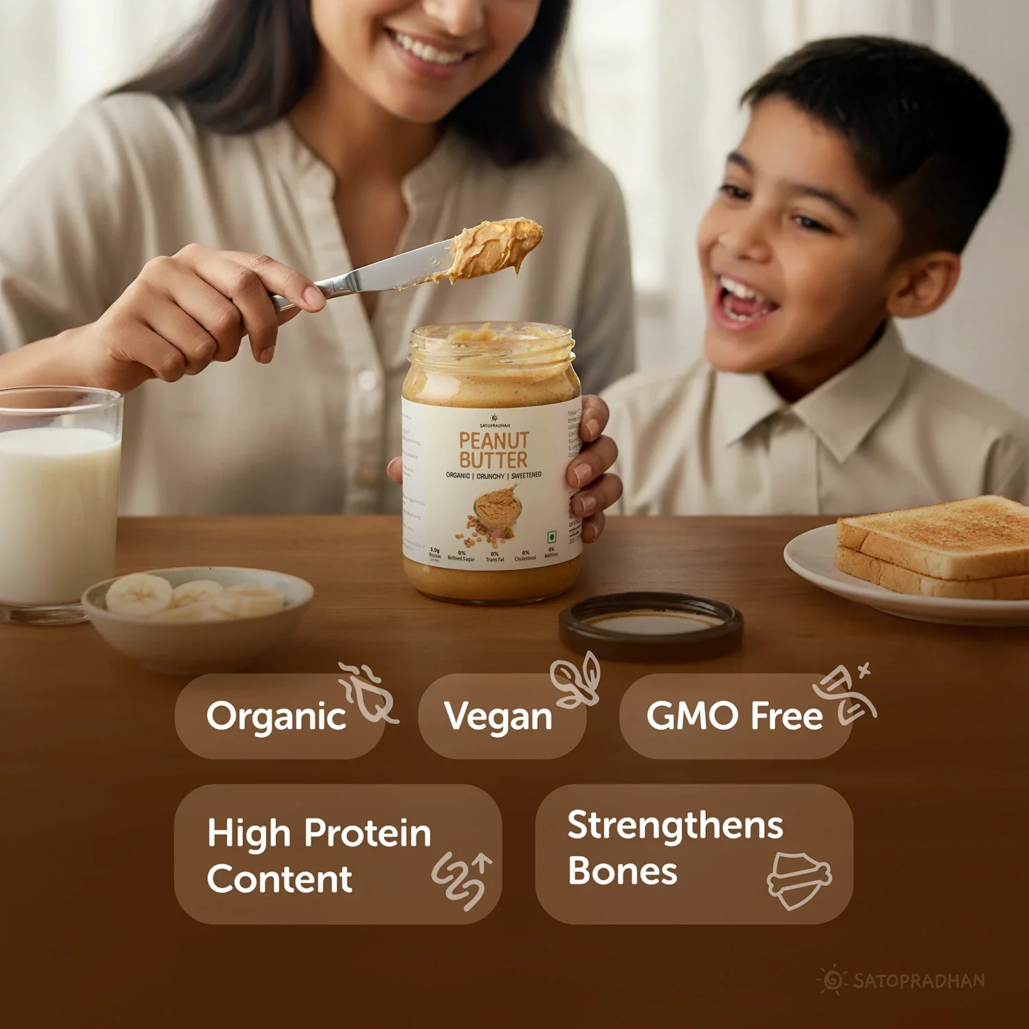 This peanut butter is 100% natural and free from stabilisers, so oil separation and jaggery settling at the bottom are natural signs of purity. On opening, stir thoroughly from the bottom with a large spoon to maintain a smooth texture.